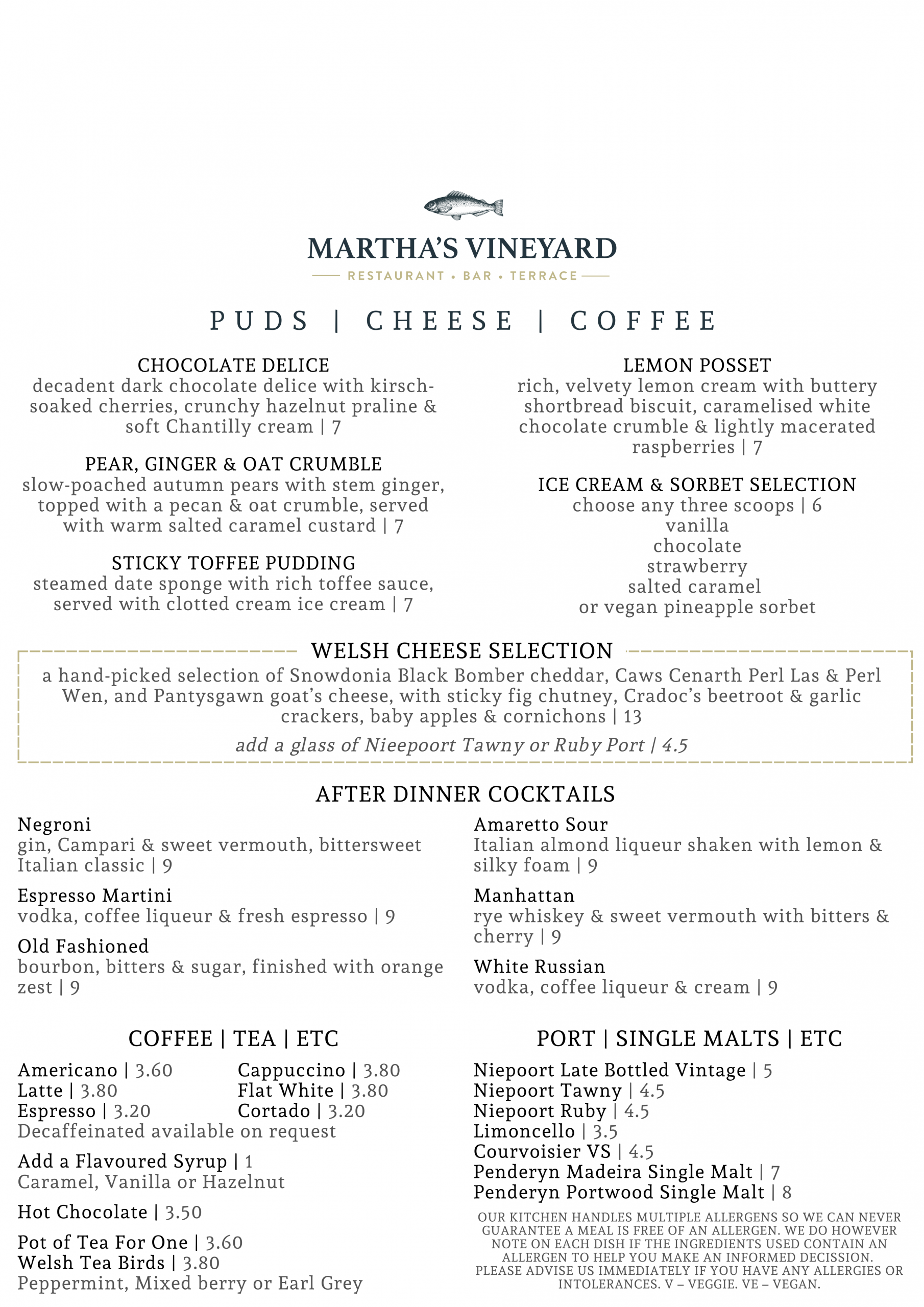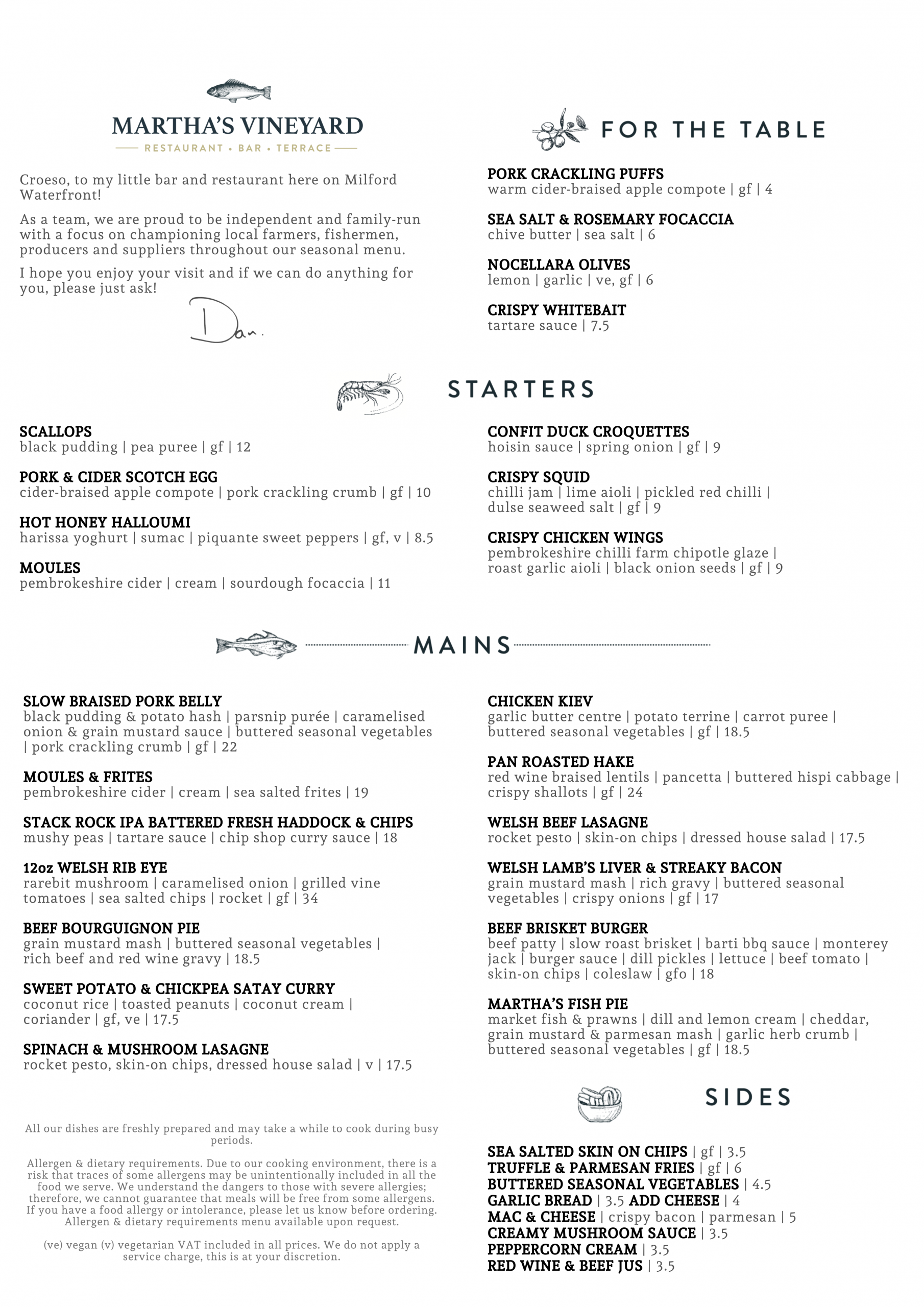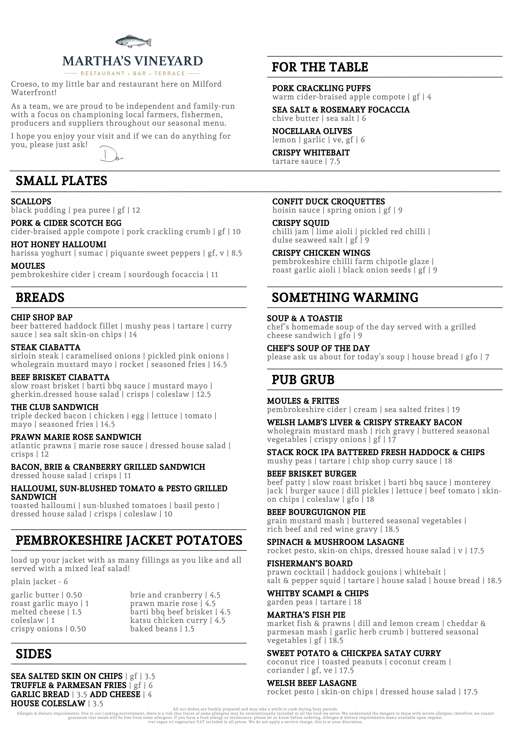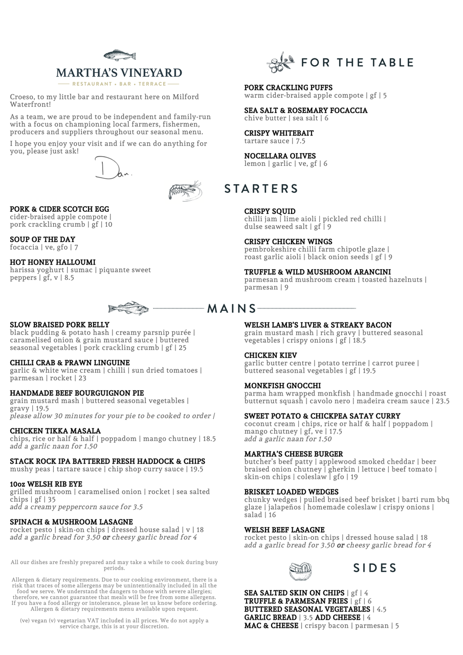 Martha’s Vineyard was the first bar and restaurant to open on the Waterfront, growing from a small family idea into one of the Marina’s landmark destinations. As an independent, family-run business, we believe great hospitality is simple: warm service, relaxed surroundings and food that lets Pembrokeshire’s ingredients shine.